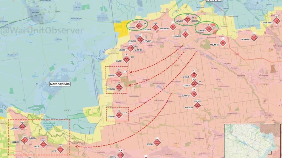 Російські війська перекидають підрозділи з півдня Покровська ближче до Дніпропетровської області, зокрема — в район Новопавлівки. За інформацією аналітичного проєкту Unit Observer, йдеться про щонайменше чотири мотострілецькі бригади.