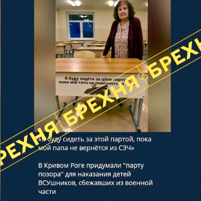 Кремлівські телеграм-канали знову розгорнули інформаційну атаку, націлену на дискредитацію України. Цього разу пропагандисти поширили фейк про нібито встановлення так званих “парт сорому” в школах Кривого Рогу для дітей військових, які начебто самовільно залишили службу.